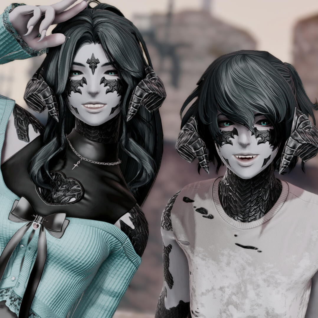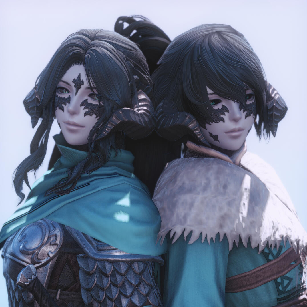 Their parents lost a child before the birth of the twins, and because of this they did not name them officially; a tradition, or perhaps superstition, in order to protect these children from the harm of negative spirits and to ensure they came to term. A named child can be stolen, after all, so they would become the nameless ones.The 'name' they were given was 'Tebis' or 'Not this One'. A saying more than a name, holding no intricate meanings or traits. They have since adopted anagrams of this to gain some individuality; even if, growing up, they were barely distinguishable. It is only now they are no longer in the Steppe and free of their duties as hunters and protectors, that they have began to show more of who they are on the outside.Once the Far East was liberated from the clutches of the empire, they felt it safe enough to explore this new found world without worrying too much about the state of their tribe - though, they return frequently to tell them of new stories and adventures they may go on.Now they explore Eorzea at the whims of Sebs, carting her sibling around on various adventures into the wild world. They make money through hunting game and other bounties, making friends and companions along the way.For the sake of time/easiness, the twins exist on one character within the game.